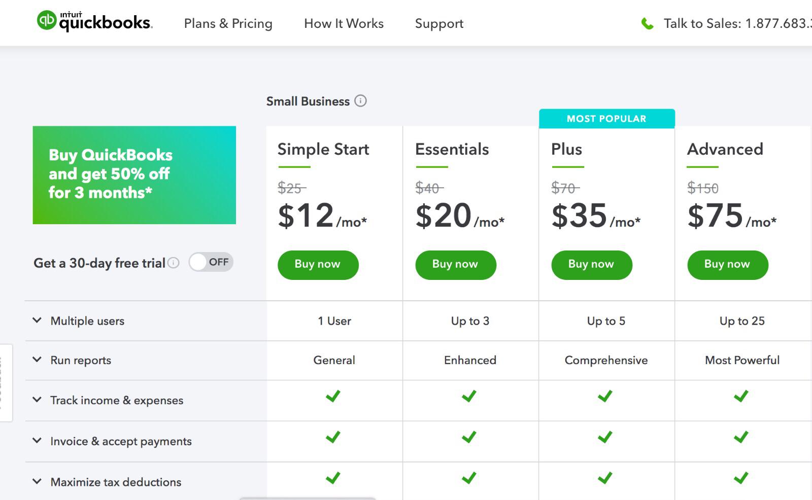 The Small Business packages begin with Simple Start and Essentials, priced at under $50 a month. Both are minimum payments any small business should be able to make, the plans offer core benefits of accounting that small businesses need.